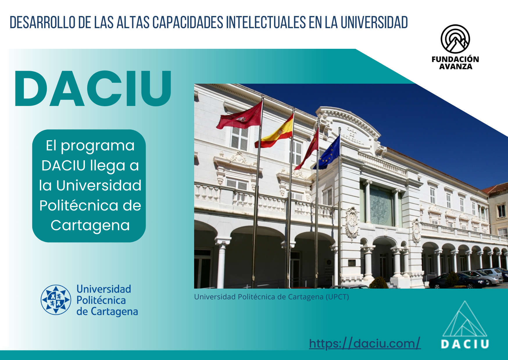En abril de 2023, la Fundación Avanza firma convenio con la UPCT para poner en marcha el programa DACIU en la UPCT. Y en mayo, se convoca al alumnado universitario y al profesorado para una presentación informativa. El siguiente paso es el envío de propuestas de investigación vigentes (por parte de los profesores) y así como la solicitud de participación en el programa *(por parte del alumnado)
