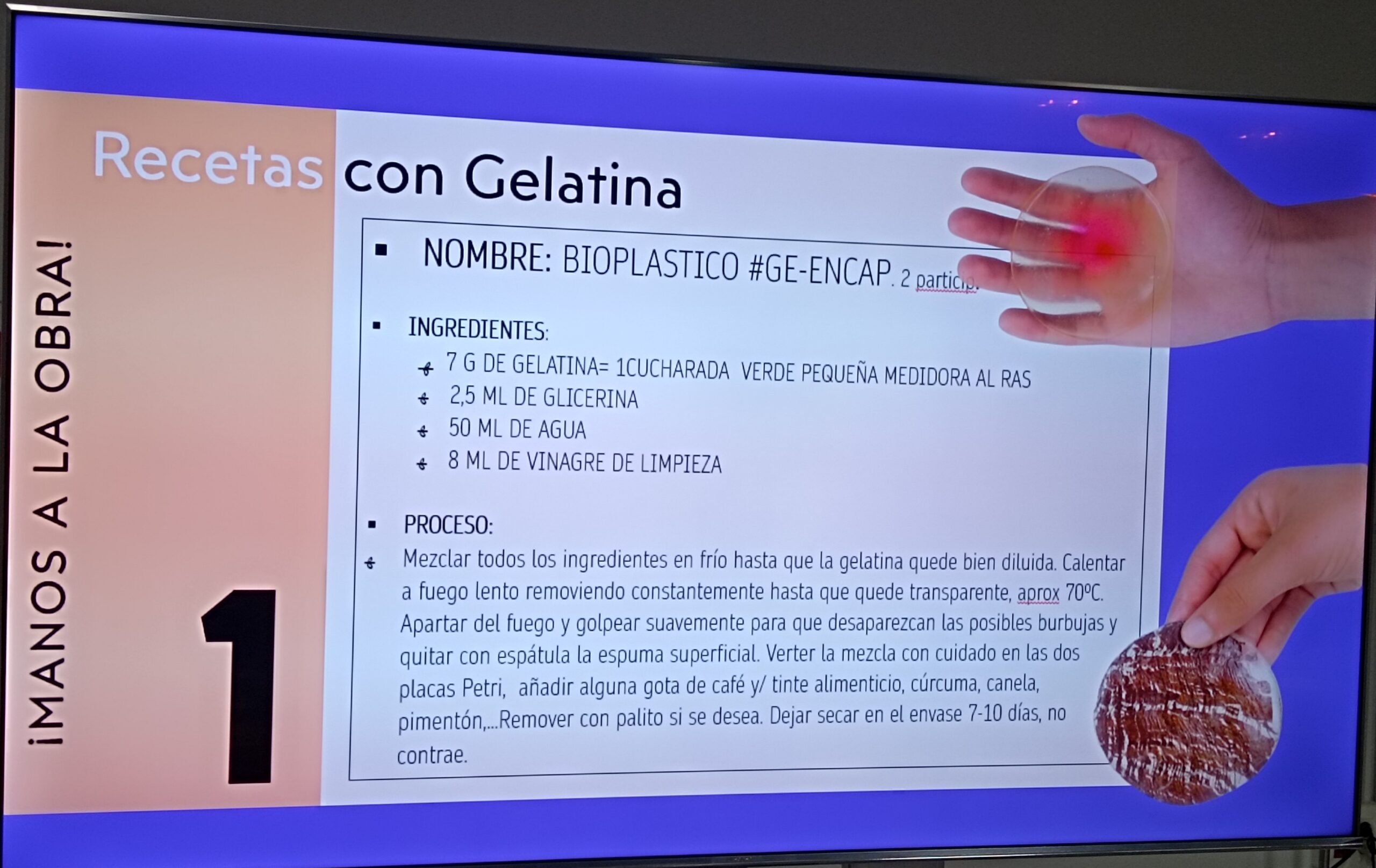 - Creación de fórmulas con Alginato, gelatina, féculas y agar-agar para la elaboración de sencillos biomateriales.